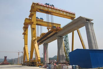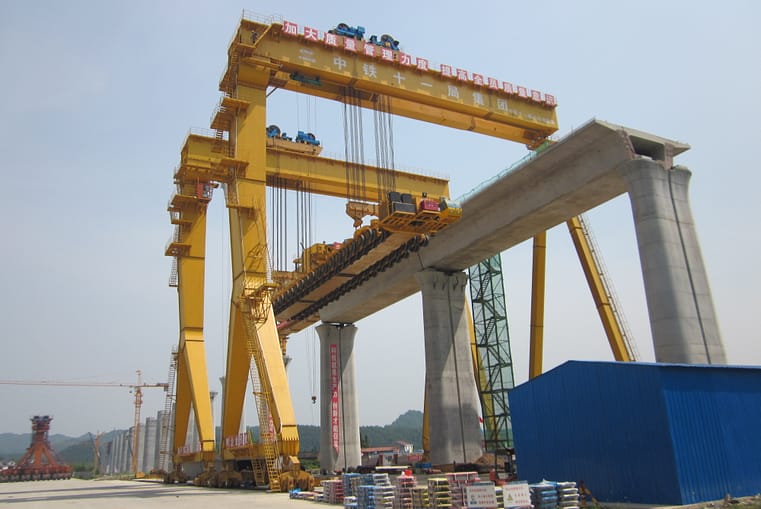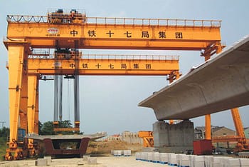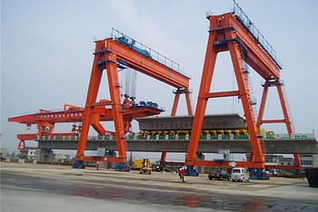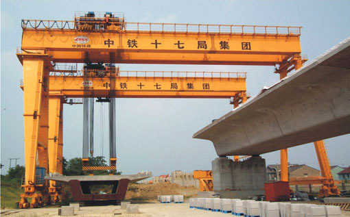 Beam lifting cranes adopt tyred line technology to finish handling all beams in the preset field, the whole crane can travel and swerve, whose lifting is driven by a hydraulic system and can realize many walk line mode, such as straight, oblique and crosswise. Its advantage is strong adaptability, high efficiency, small occupied area and no need to lay the rail. In the construction of the high-speed railway in China, this kind crane is used to lift, handle and load the beam by most preset field.