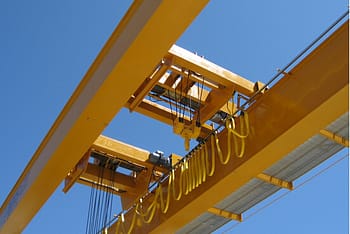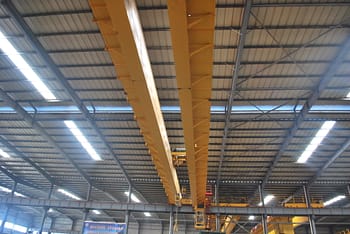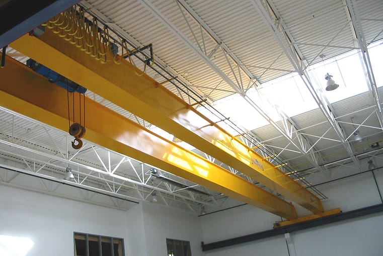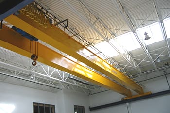 電動ホイスト付きダブルガーダー・オーバーヘッド・クレーンは、固定された支持体の上を走行します。