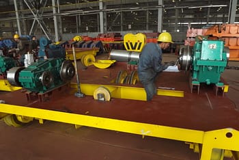 Este carrinho elétrico para Ponte Rolante suspenso de viga dupla é composto de estrutura de carrinho tipo caixa rígida, motor, freio hidráulico, tambor, redutor, acoplamento, roldana, gancho, etc.